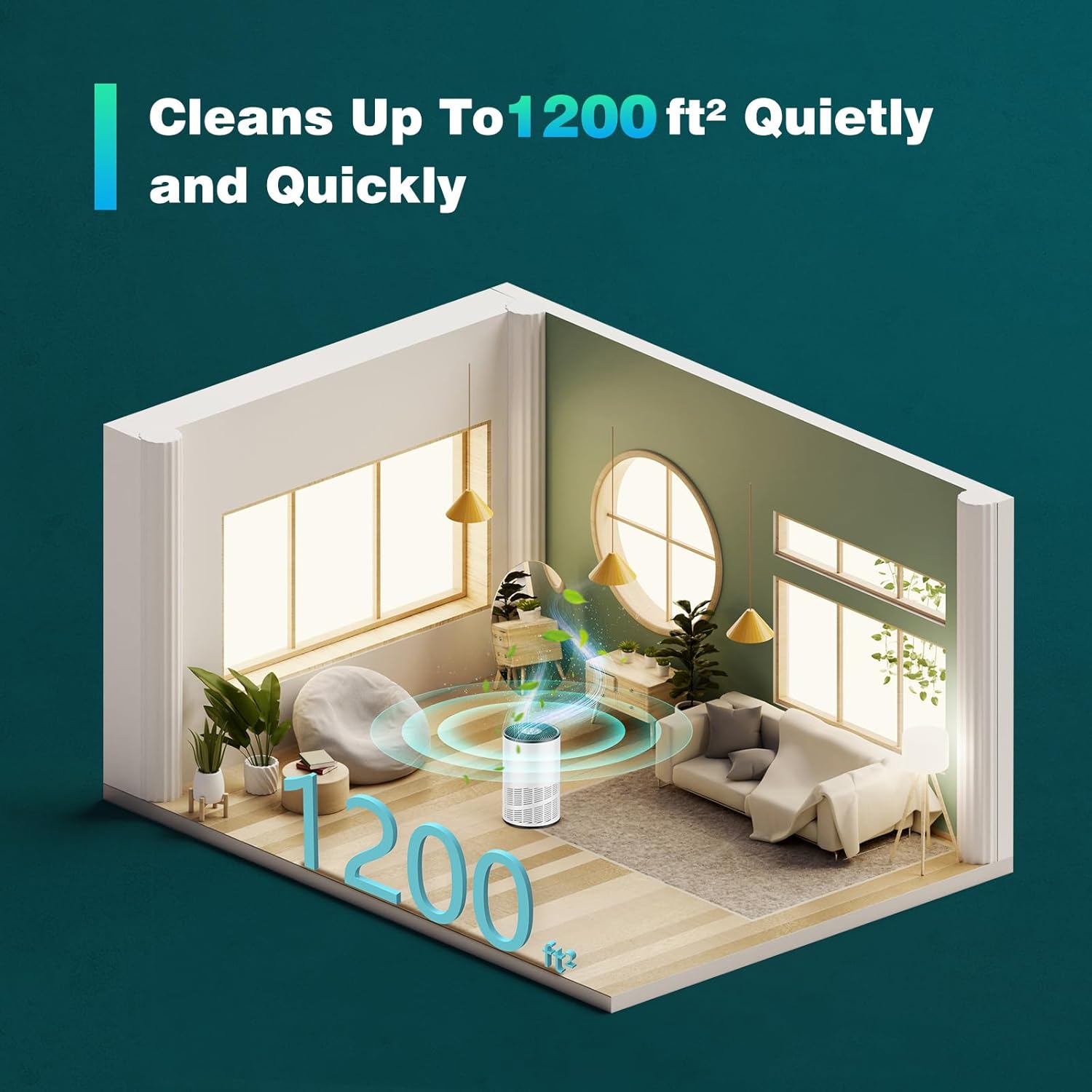 The purifier is rated for up to 1200 sq ft of coverage, which is suitable for large living rooms, basements, and open-concept spaces. For maximum effectiveness in rooms that size, keep doors closed and position the unit centrally.