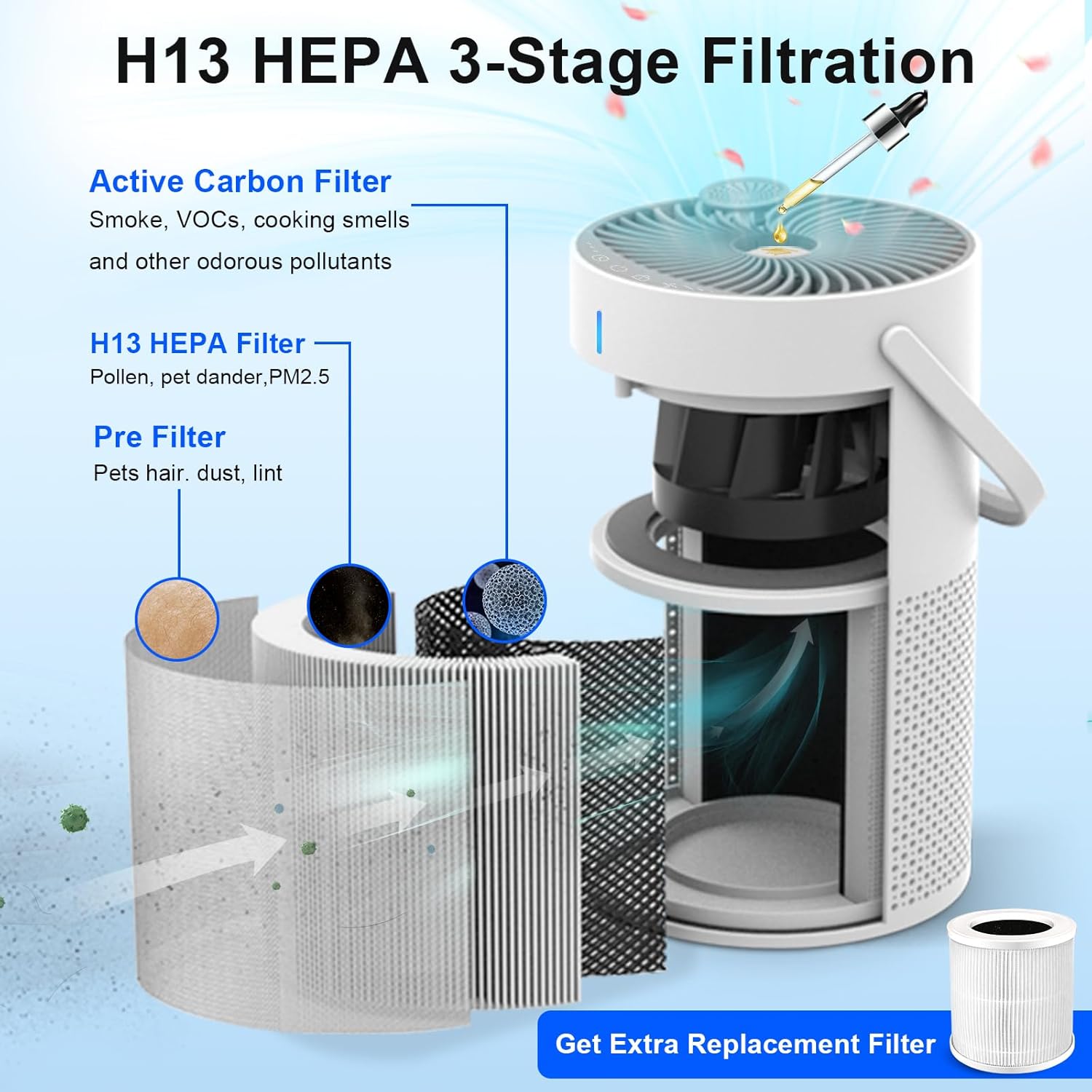 H13 HEPA filter captures 99.95% of airborne particles at 0.3 microns , medical-grade filtration for allergies, dust, and pet dander