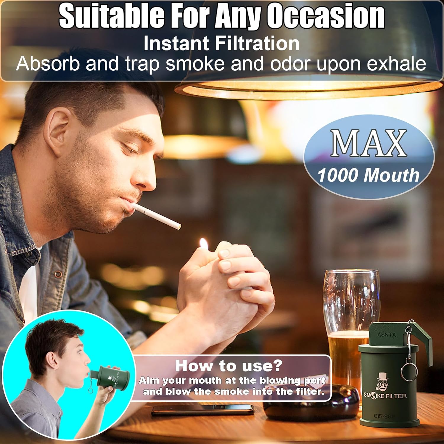 You exhale smoke directly through the device, and the activated carbon filter element inside absorbs smoke particles and odor compounds before the air exits the other side. It's a passive, blow-through design , not a fan-powered air purifier.